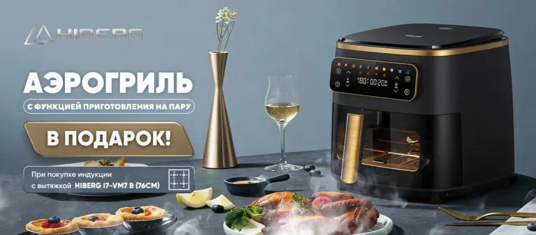 При покупке индукционной варочной панели с вытяжкой HIBERG i7-VM7 B (76см) в подарок аэрогриль HIBERG MGS 750 BG !