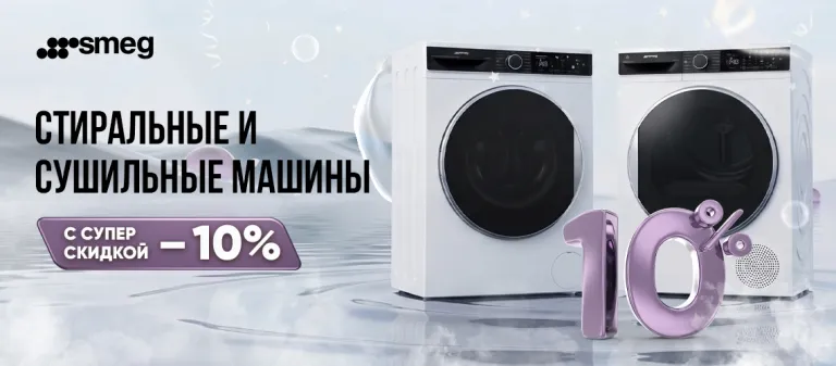 При покупке стиральной, сушильной или стирально-сушильной машины, включая встраиваемые, SMEG предоставляется дополнительная скидка 10%.