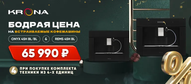 При покупке комплекта встраиваемой техники KRONA из 4 единиц, у покупателя есть уникальная возможность приобрести встраиваемую кофемашину ONYX или REMS с черным закаленным стеклом, системой автоматической очистки от накипи и капучинатором по БОДРОЙ цене всего за 65 000 рублей.